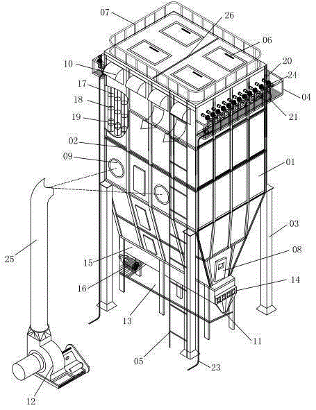包括袋子、袋笼、花板等,每个袋子都被袋子复盖,以防止袋子被压扁,花板支持袋子组装体、袋室和网络气室,成为吸尘器除灰系统组装体的检修台。