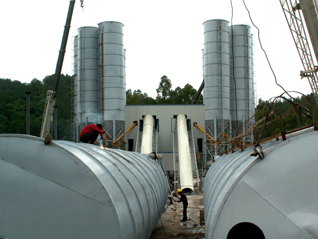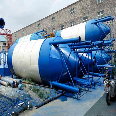 3.水泥储罐一般为圆筒支架结构,其上部有除尘设备,防止粉尘泄漏,下部装有破拱装置,防止粉料结块,使粉料卸出顺畅,并装有料位传感设备,可随时掌握仓内物料使用情况。